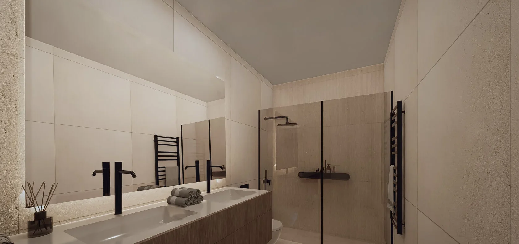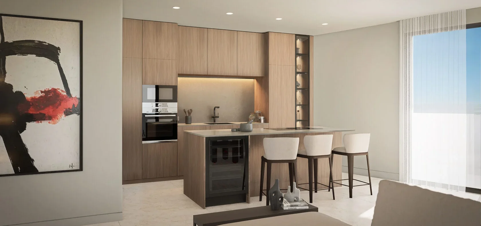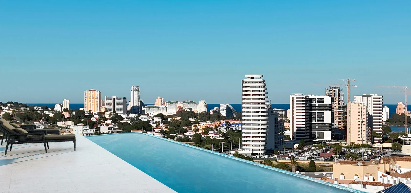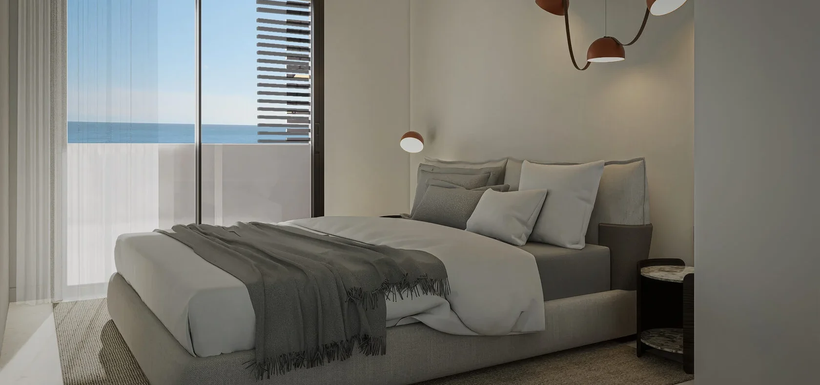 Las viviendas ofrecen amplias terrazas privadas (muchas de ellas con vistas al mar), cocinas completamente equipadas con electrodomésticos BOSCH o equivalentes, aire acondicionado por conductos (frío/calor), sistema de aerotermia para el agua caliente sanitaria y carpintería exterior de aluminio con doble acristalamiento.
